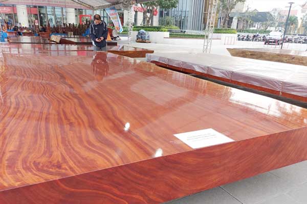 Đây là tấm gỗ Hương nhập khẩu từ Nam Phi với kích thước dài 6,02m, rộng hơn 2,6m, dày 30cm được rao giá 1,2 tỉ đồng.