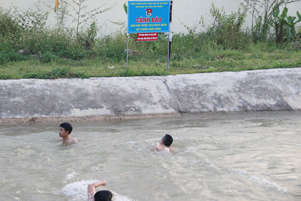 Trên đoạn kênh đào khối 1, thị trấn Yên Thành, huyện Yên Thành, dù đã có biển cảnh báo đuối nước, nhưng vào mỗi buổi chiều, người dân chen chúc nhau tắm, đa số không sử dụng áo phao.