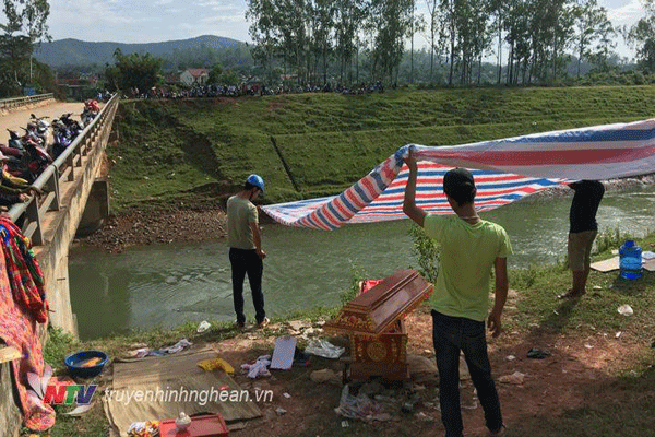 Thi thể Nguyễn Công Đức được chuyển về điểm xảy ra đuối nước để làm lễ nhập quan.