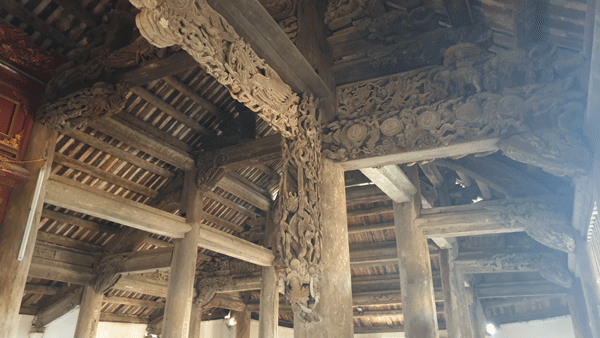 Cột đình được làm bằng gỗ lim và chò chỉ, đường kính lớn, đều nhau. Rải đều trên 2 mái bằng gỗ lim tròn còn có 26 đường hoành và 42 đường xà, các đường chân thủy bao quanh. Các hoa văn trong đình được chạm khắc rất công phu, có độ tinh xảo cao như: bát tiên, cưỡi hạc, đánh cờ, đua thuyền, tứ linh, tứ quý, đại bàng đối xứng từng gian, rồng ổ… thể hiện quan điểm triết lý nhân sinh thấm đẫm tinh thần nhân văn của dân tộc và phản ánh nghệ thuật chạm khắc đã đạt đến trình độ bậc thầy.
