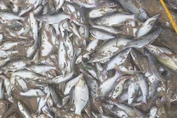 Số lượng lớn cá chết bất thường trên sông được người dân vớt lên.