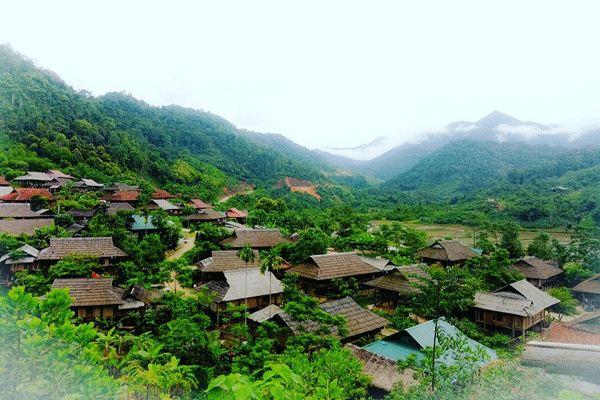 Một góc bản Hủa Mương với những nếp nhà sàn cổ san sát lợp bằng gỗ sa mu đặc trưng