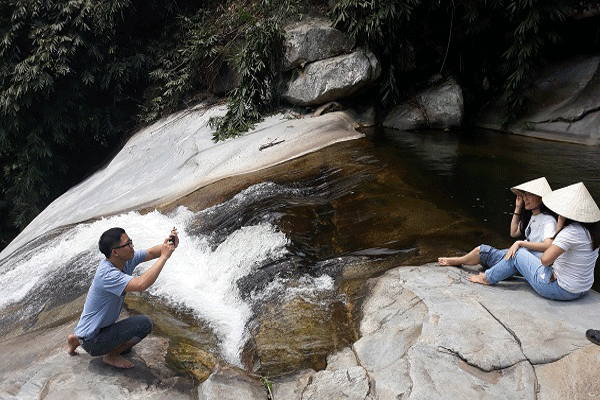 Du khách thích thú tạo dáng chụp ảnh bên dòng thác