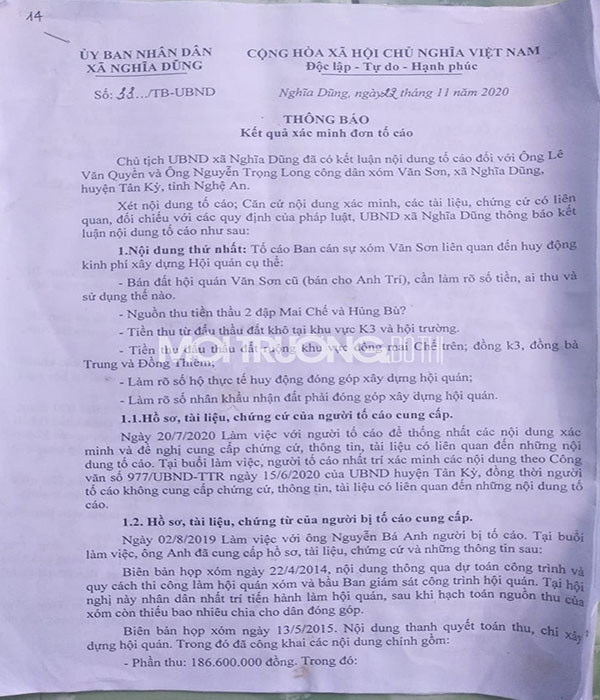 Theo Kết luận nội dung tố cáo số 04/KL-UBND ngày 26/3/2020 đối với Ban xóm (Văn Sơn cũ) nay là xóm Tân Văn nhiệm kỳ 2014 – 2017; 2017-2019 và thông báo kết quả xác minh đơn tố cáo sô 33/TB-UBND ngày 22/11/2020 của UBND xã Nghĩa Dũng, cho thấy: