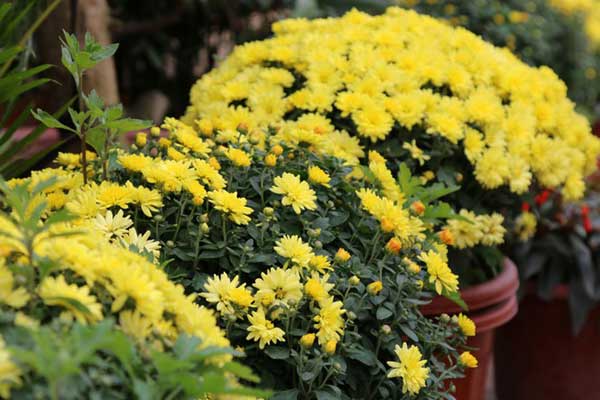 Những chậu cúc mâm xôi vàng rực, tròn đều được bán với giá từ 80.000 - 250.000 đồng tùy kích cỡ.