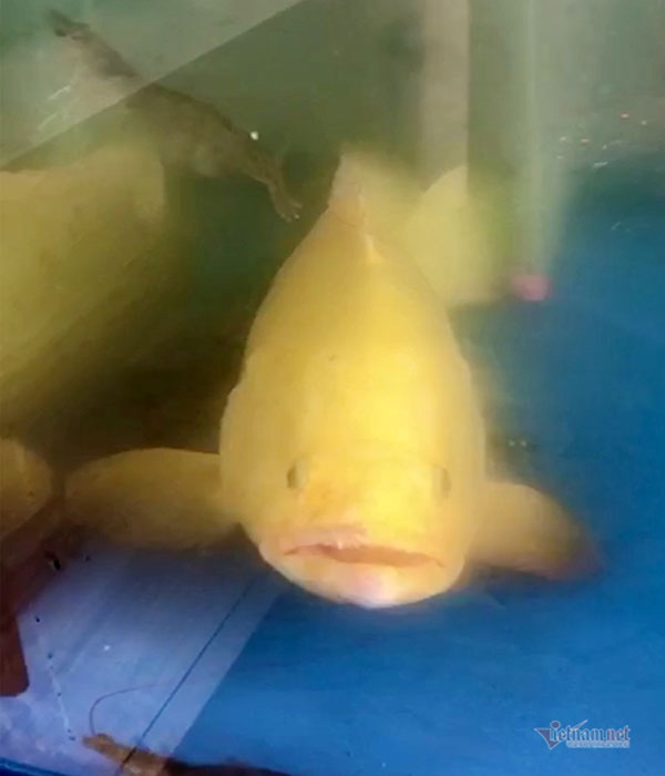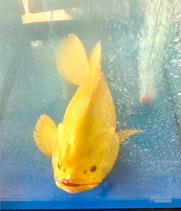 Con cá mú vàng đột biến có đôi mắt màu đỏ, thân và các bộ phận màu vàng. Hỏi rất nhiều ngư dân nhưng chưa ai từng thấy con cá mú như vậy.