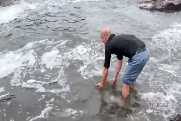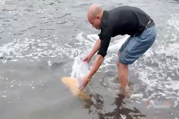 Chiều tối 25/3, anh Sơn và một người bạn âm thầm thả con cá mú vàng về với biển. Anh không muốn nhiều người chứng kiến vì sợ nguy cơ cá bị bắt lại.