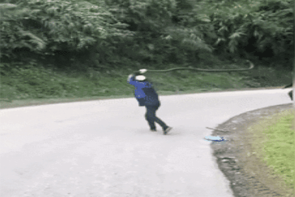 Thế nhưng người đàn ông lại không hề sợ hãi, đứng giữa đường cầm đuôi con rắn rồi quay nó gần 20 vòng trên đầu. Sau đó, anh ta quăng mạnh nó xuống đất.