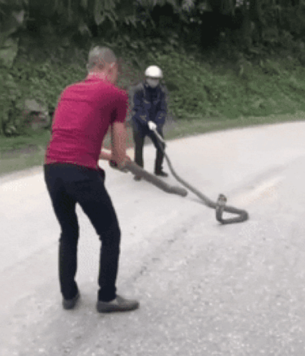 Khi được thả ra, con rắn vội vàng tìm đường thoát thân nhưng nhanh chóng bị người đàn ông bắt lại. Anh kéo con rắn ra giữa đường, một người đàn ông khác dùng gậy ghì chặt đầu con rắn để anh dùng tay bóp chặt cổ nó.