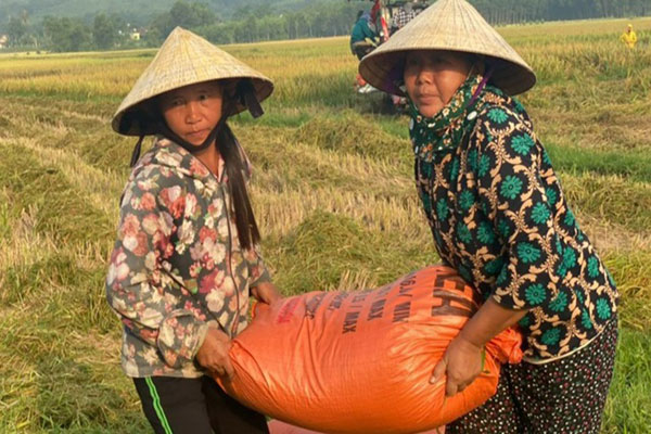 Những người phụ nữ cũng tham gia bốc thóc lên xe.