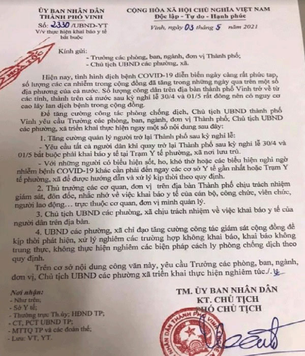 Ngày 3/5, UBND TP Vinh (Nghệ An) ra công văn 2330/UBND-YT về việc thực hiện khai báo y tế bắt buộc.