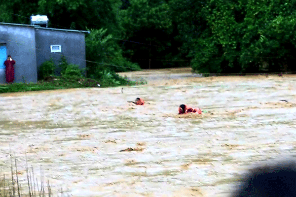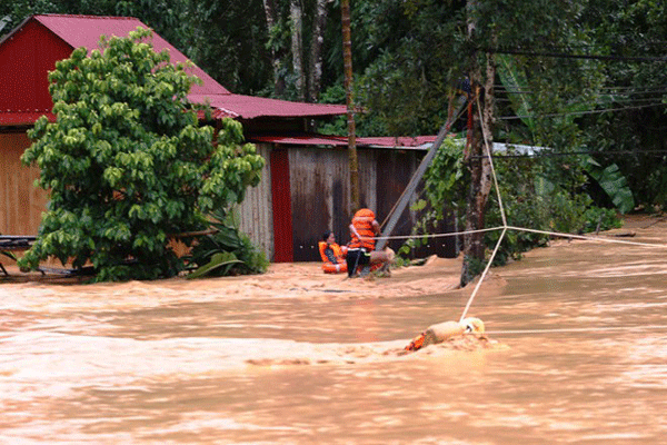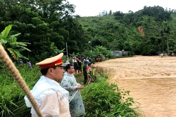 Trận lũ từ thượng nguồn sông A Vương đột ngột tràn xuống nhà dân ở thôn Ahu (xã A Tiêng, H.Tây Giang, Quảng Nam) khiến gần 30 người bị mắc kẹt. Các chiến sĩ, công an phải đu dây vượt sông cứu người.