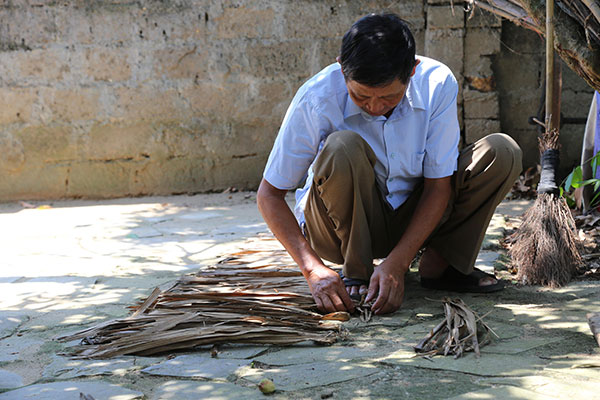 Tuy nhiên, theo ông Huệ, đó vẫn chưa phải công đoạn mất nhiều thời gian, công sức nhất. Giai đoạn cầu kỳ hơn cả là việc thu mua lá mía. “Lá mía phải là lá 1, lá 2, lá 3; còn từ lá thứ 4 trở đi không còn được to, rộng và bền nữa.Lá mía sau khi đã phơi khô tiếp tục đem ra phơi sương qua nhiều đêm để lá nở ra, có độ dai. Muốn có được lá mía ưng ý, có thời điểm tôi và vợ phải đi lùng khắp nơi, tự tay lựa chọn, nâng niu từng lá một”, ông Huệ nhớ lại.
