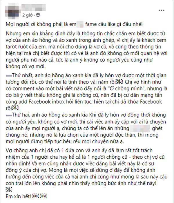 "Anh áo hồng kia khi ly hôn vợ thì không có người yêu, không có vợ mới, việc anh ấy cặp với ai là chuyện của anh ấy mọi người ạ, chúng ta có thể lên án những "tiểu tam", ghét chúng nó, nhưng nó là lựa chọn của một người độc thân, thì mong mọi người đừng tiếp tục bêu rếu mọi chuyện nữa ạ.