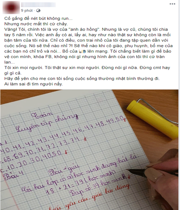 Vâng! Tôi, chính tôi là vợ của "anh áo hồng". Nhưng là vợ cũ, chúng tôi chia tay 5 năm rồi. Việc anh ấy có ai, lấy ai, hay như nào thật sự không còn là mối bận tâm của tôi nữa. Chỉ có điều, con trai nhỏ của tôi đang tập quen dần với cuộc sống. Nó sẽ thế nào nhỉ?! Sẽ thế nào khi cô giáo, phụ huynh, bố mẹ của các bạn nó chỉ trỏ và nói... Bố của B (tên cậu bé) lên mạng. Tôi chẳng biết làm gì để bảo vệ con mình, khóa facebook, không nói gì nhưng hình ảnh của con tôi thì cứ tràn lan...