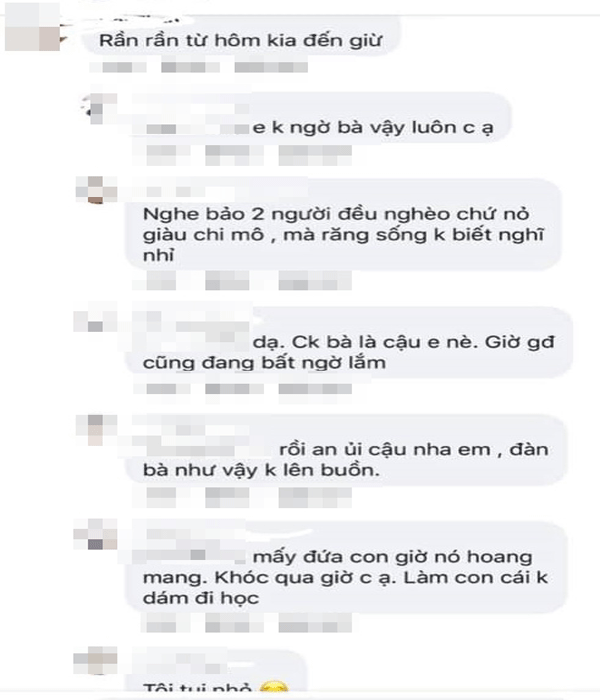 “Em không ngờ bà vậy luôn chị ạ. Chồng bà là cậu em này, giờ gia đình bất ngờ lắm vì họ đã ly hôn đâu. Mấy đứa con giờ nó hoang mang, khóc từ qua giờ, làm con cái không dám đi học”, người này cho hay.