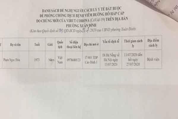 Vào tối ngày 26/7, UBND Phường Xuân Đỉnh, Hà Nội đã quyết định đưa anh P.N.Đ (SN 1973, ở Tổ dân phố Cáo Đình 1) đi cách ly tại cơ sở y tế để phòng COVID-19. Trước đó gần 2 tuần, anh Đ. có đi về từ Đà Nẵng và có biểu hiện sốt, ho, sổ mũi, rát họng. Ngoài ra 4 người thân của anh Đ. cũng được áp dụng biện pháp cách ly tại nhà.