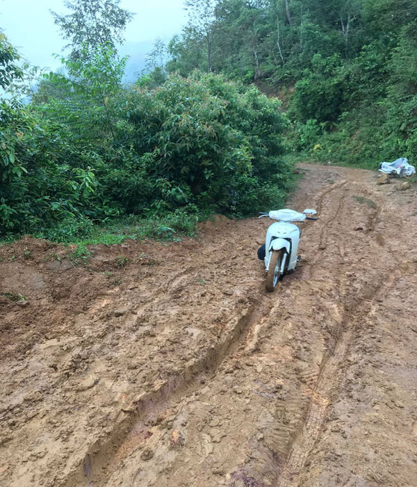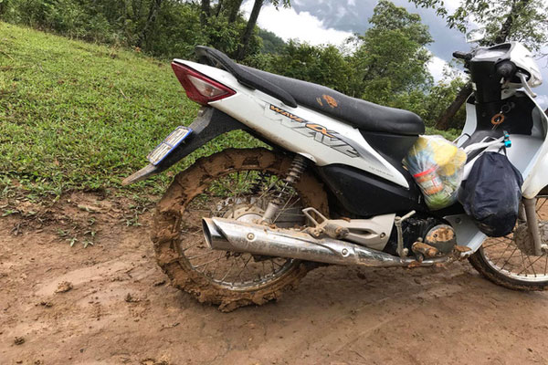 Cho nên khi đi hết đường bê tông, cô phải lắp xích tự chế vào bánh xe mới có thể tiếp tục vượt qua những con dốc đầy bùn đất, lầy lội. Hành trình này bắt đầu từ 5 rưỡi tới tận 9 giờ sáng, quả thực không hề dễ dàng. Nếu may mắn gặp người dân sống quanh bản, họ cũng sẵn sàng giúp đỡ nhiệt tình.