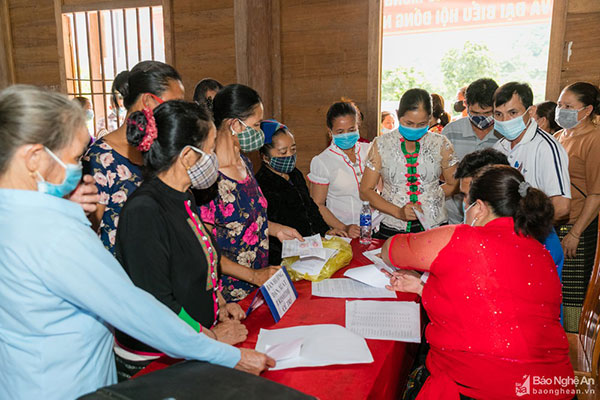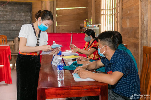 Bản Huồi Tố 1 có 177 cử tri, chủ yếu là đồng bào dân tộc Thái. Trong ảnh, các cử tri đang xuất trình thẻ cử tri để làm thủ tục bỏ phiếu. Ảnh: Đức Anh