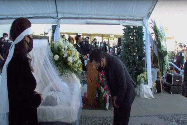 Nghệ sĩ Vân Sơn cúi đầu rất lâu trước linh cữu cố nghệ sĩ Chí Tài. Ảnh cắt từ clip