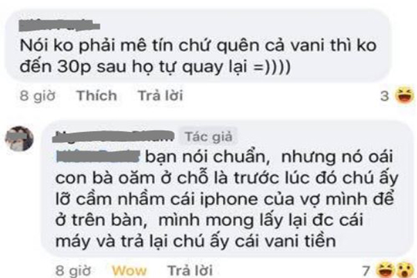 Khi có người nói rằng, nếu số tiền lớn như vậy, hẳn chủ nhân của nó sẽ sớm trở lại quán ăn để nhận thì N.S.P cho biết thêm, trong lúc rời đi, người đàn ông này đã…cầm nhầm chiếc Iphone của vợ anh. Dù không biết là vô tình hay cố ý, nhưng anh mong muốn được nhận lại điện thoại và sẽ trao trả vali cho người bị mất.