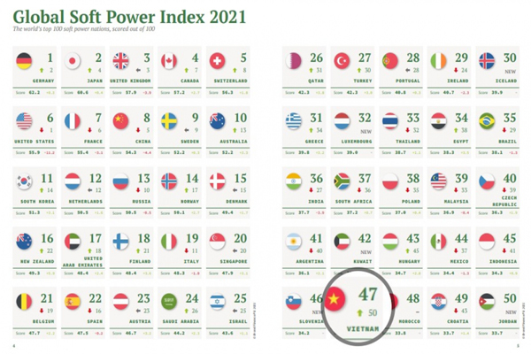 Trong bảng xếp hạng “quyền lực mềm” toàn cầu 2021, Việt Nam là quốc gia duy nhất trong ASEAN có sự dịch chuyển, thăng 3 bậc so với năm ngoái, từ vị trí 50 lên 47. Trong khu vực Châu Á, ảnh hưởng của Việt Nam được xếp hạng 9. Tổng điểm của Việt Nam là 33,8/100, đứng trên nhiều quốc gia thuộc khu vực Đông Nam Á như Philippines, Campuchia, Myanmar và đứng sau Singapore, Thái Lan, Malaysia, Indonesia.
