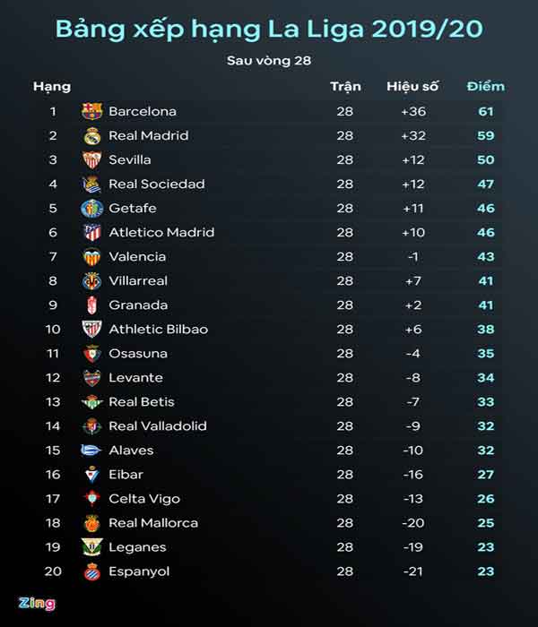 La Liga chính thức bắt đầu từ ngày 12/6 với trận đấu giữa Sevilla và Real Betis. Sáng sớm 15/6 (giờ Việt Nam) Real Madrid sẽ so tài cùng Eibar trên sân nhà. Kết thúc vòng 27, Barcelona đang dẫn đầu bảng xếp hạng với 58 điểm. Xếp ngay sau là Real Madrid chỉ kém 2 điểm và khoảng cách này rất dễ để kéo gần.