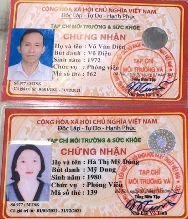 Đi cùng Dung và Duyên còn có Võ Văn Diện (SN 1972, cùng quê xã Bình Tú, huyện Thăng Bình, tỉnh Quảng Nam). Phòng Cảnh sát Kinh tế Công an tỉnh Quảng Ngãi còn tạm giữ của Dung và Diện 2 giấy chứng nhận phóng viên (cùng số 977, do Tạp chí Môi trường và Sức khoẻ cấp cùng ngày -1-1-2021, giá trị thẻ đến ngày 31-12-2021) cùng nhiều hợp đồng và thủ tục nhận tiền của các doanh nghiệp khác tại các tỉnh miền Trung được để trên ô tô BS: 43A-53153 và trong túi xách, ví của các đối tượng.