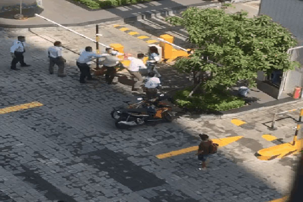 Đôi bên xảy ra tranh cãi. Người phụ nữ vung tay đánh trả thì bị thanh niên đánh bay mũ bảo hiểm. Lúc này, một số nhân viên bảo vệ tới can ngăn nhưng cả hai không ai chịu nhường ai.