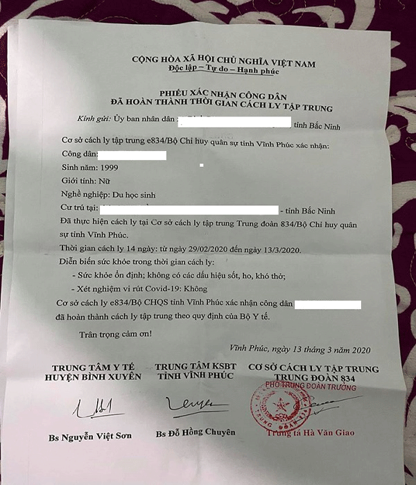 Phiếu xác nhận đã hoàn thành 14 ngày cách ly sau khi cô gái trở về từ Hàn Quốc