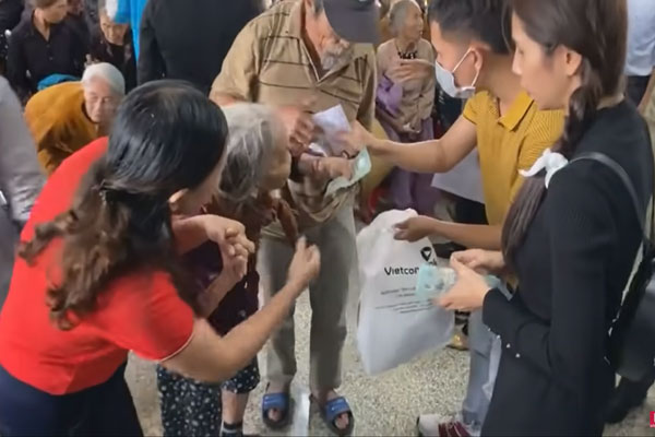 "Khoan khoan, bây giờ con thấy người lớn tuổi, khó khăn về đi lại ở đây rất nhiều nên các cô bác lớn tuổi cứ ngồi tại chỗ, con sẽ đến từng người phát tiền".