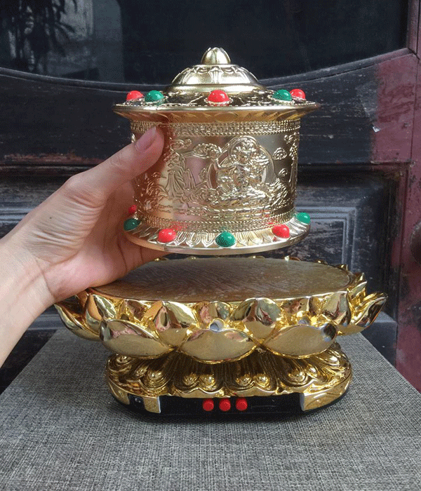 Bánh xe cầu nguyện là một bánh xe hình trụ trên một trục chính làm từ kim loại, gỗ, đá, da thuộc hoặc sợi bông thô. Theo truyền thống, câu thần chú Om Mani Padme Hum được viết bằng ngôn ngữ Newari của Nepal, ở bên ngoài bánh xe.