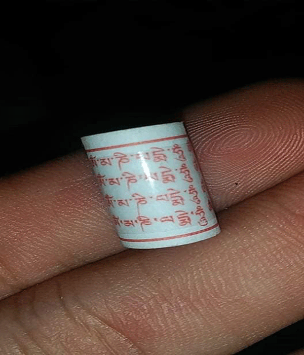Hàng ngàn (hoặc trong trường hợp bánh xe cầu nguyện lớn hơn, hàng triệu) thần chú sau đó được quấn quanh cây sự sống này. Thần chú Om Mani Padme Hum được sử dụng phổ biến nhất, nhưng những câu thần chú khác cũng có thể được sử dụng.