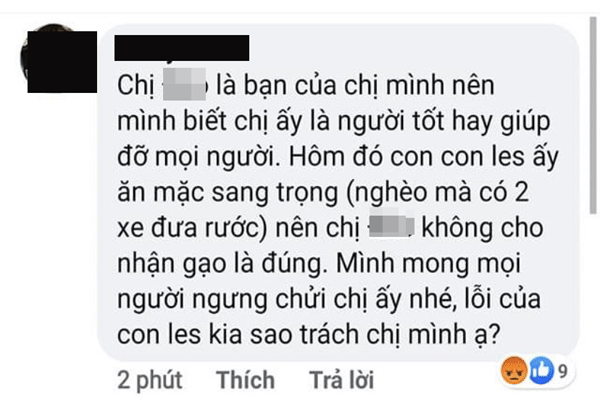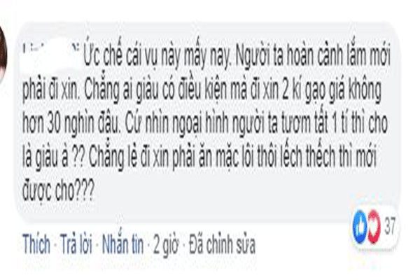 "1-2kg gạo, rồi youtube, quản lý, bảo vệ phát loa ngăn chặn, quay lại rồi tung lên mạng xã hội để đánh giá nhân phẩm người ta. Từ thiện là từ bi, chứ không phân biệt chiếc áo đang mặc, hay chiếc xe đang đi. Có đói có khổ, người ta mới đi xin 2kg gạo. Giá trị của nó là khoảng Ba Mươi Ngàn Đồng, thật lòng không ai sang giàu mà đội nắng đội mưa đi xếp hàng xin gạo để bị bôi nhọ như vậy.