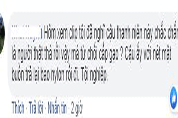 Tiếc cho một hoạt động ý nghĩa đang bị méo mó bởi các cá nhân xấυ xí. Nhìn ánh mắt cậu trai ấy, hẳn nhiều người nhận ra sự buồn bã, mệt mỏi, đôi mắt như muốn khóc đến nơi vì bị tưởng là lừa đảo. Có đói lắm mới hạ danh dự của một người đàn ông xuống để xin một bữa cơm. Sức dài vai rộng thì sao, thời điểm này ai cũng bị nghỉ việc, không có công việc thì trai hay gái, khoẻ hay bệnh thì không có tiền vẫn sẽ đói thôi." Một cư dân mạng lên tiếng.