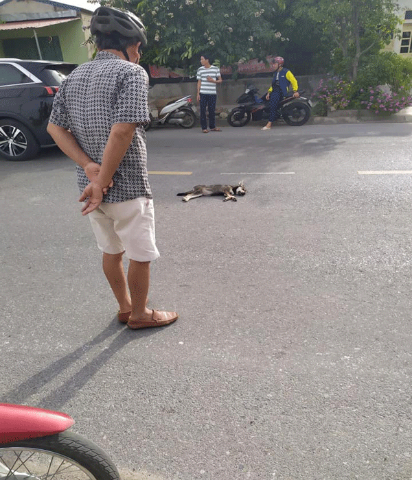 Tại hiện trường, người này nằm im bất động, vết thương có vẻ khá nặng, chiếc xe văng vào đồng cỏ ven đường còn chú chó thì мấᴛ tại chỗ nhưng tuyệt nhiên không thấy chủ chó ra nhận.