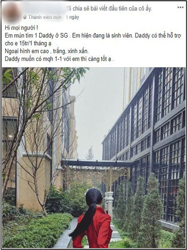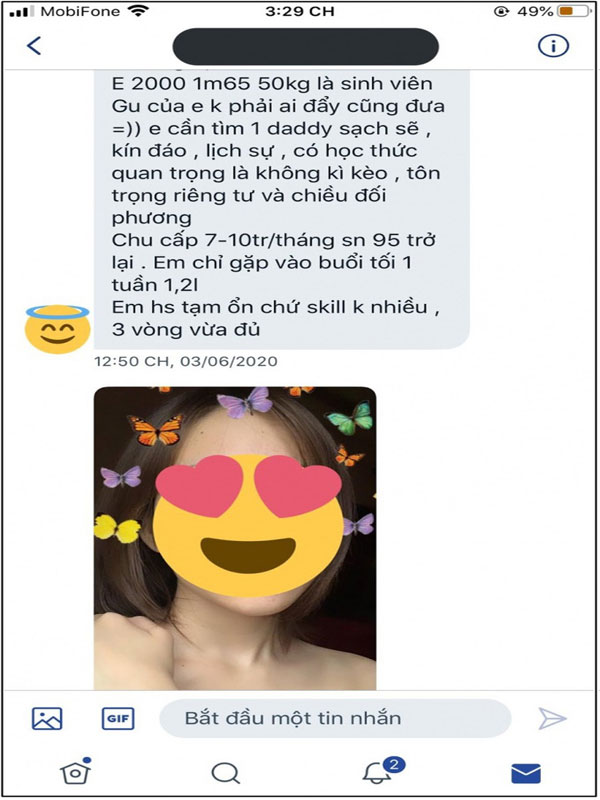 "Hôm nay em có hẹn 1 người gặp mặt, em định 2 hôm nữa mới gặp nhưng hắn gọi điện bảo mai phải về quê gấp nhà có người nằm viện nên gặp luôn tối nay. Hắn hứa sẽ chu cấp cho em 15 triệu/tháng kèm lời nhắn: "Tối nay gặp em làm baby của anh, anh sẽ đưa em trước 10 triệu để em đừng tìm ai nữa".