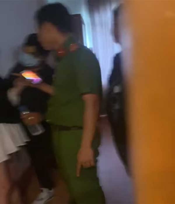 Anh công an cũng có mặt ở ngoài cửa phòng, liên lục yêu cầu cặp đôi ra mặt, thế nhưng không ăn thua.