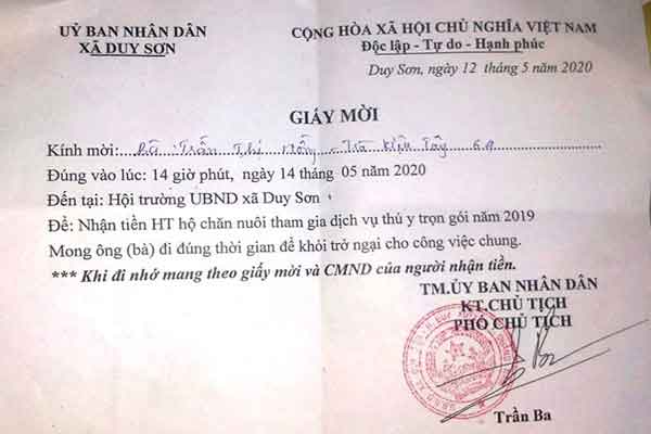 Giấy mời chính quyền xã Duy Sơn gửi cho người dân để đến nhận tiền hỗ trợ. Ảnh: Nam Thịnh