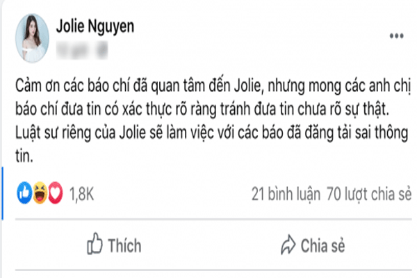 Cụ thể, cô viết trên Facebook cá nhân: “Cảm ơn các báo chí đã quan tâm đến Jolie, nhưng mong các anh chị báo chí đưa tin có xác thực rõ ràng tránh đưa tin chưa rõ sự thật. Luật sư riêng của Jolie sẽ làm việc với các báo đã đăng tải sai thông tin”. Hiện, chia sẻ mới này của Jolie nhận nhiều sự quan tâm của công chúng.