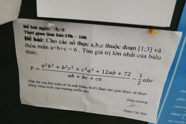Theo đó, hiệu trưởng của một ngôi trường đã yêu cầu học trò giải một bài tập Toán Đại số. Câu hỏi nêu ra là tìm giá trị lớn nhất của một biểu thức dài ngoằng mà ai đã đi qua thời học sinh đọc vào cũng chẳng hiểu gì. Ai có đáp án đúng sẽ tìm luôn được cả mật khẩu wifi và tha hồ sử dụng miễn phí.