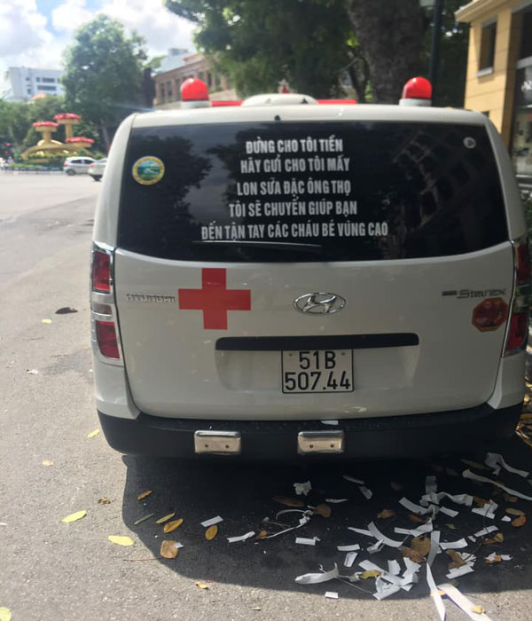 "Đừng cho tôi tiền, hãy gửi cho tôi mấy lon sữa đặc Ông Thọ. Tôi sẽ chuyển giúp các bạn đến tận tay các cháu bé vùng cao" - nội dung dòng chữ phía sau xe ông Hải.