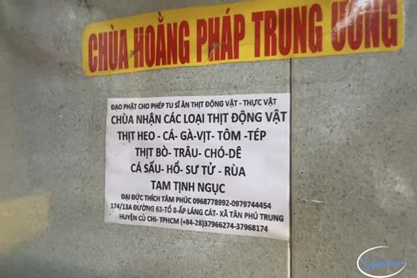 Ngay khu vực chánh điện thờ các vị Phật, nhiều bảng thông báo được ghi với nội dung “Chùa nhận các loại thịt động vật heo, cá…”, kể cả thịt chó, cá sấu, hổ, sư tử khiến cộng đồng mạng xôn xao.