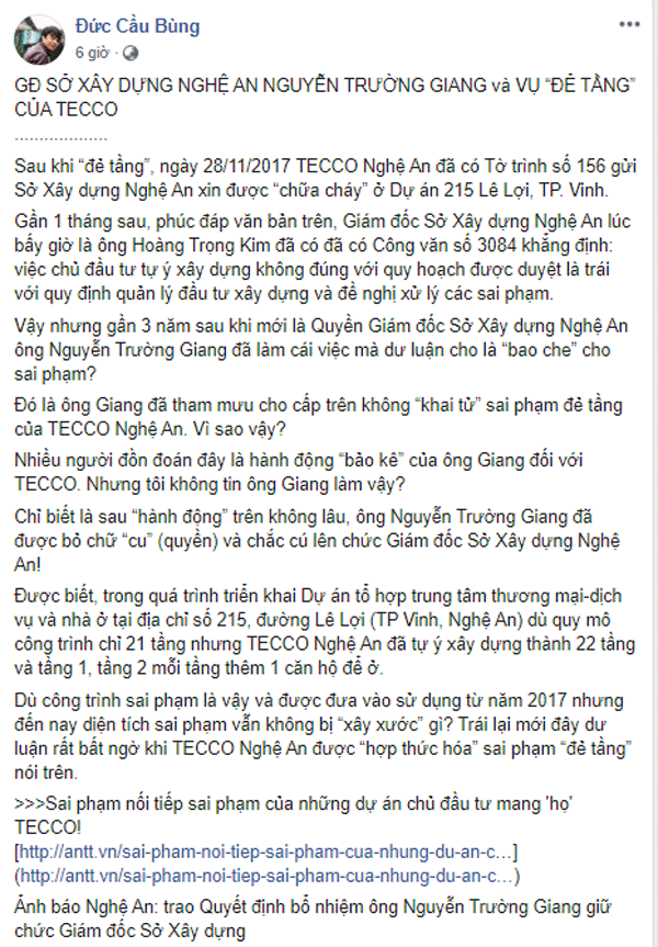 Chỉ biết là sau “hành động” trên không lâu, ông Nguyễn Trường Giang đã được bỏ chữ “cu” (quyền) và chắc cú lên chức Giám đốc Sở Xây dựng Nghệ An!